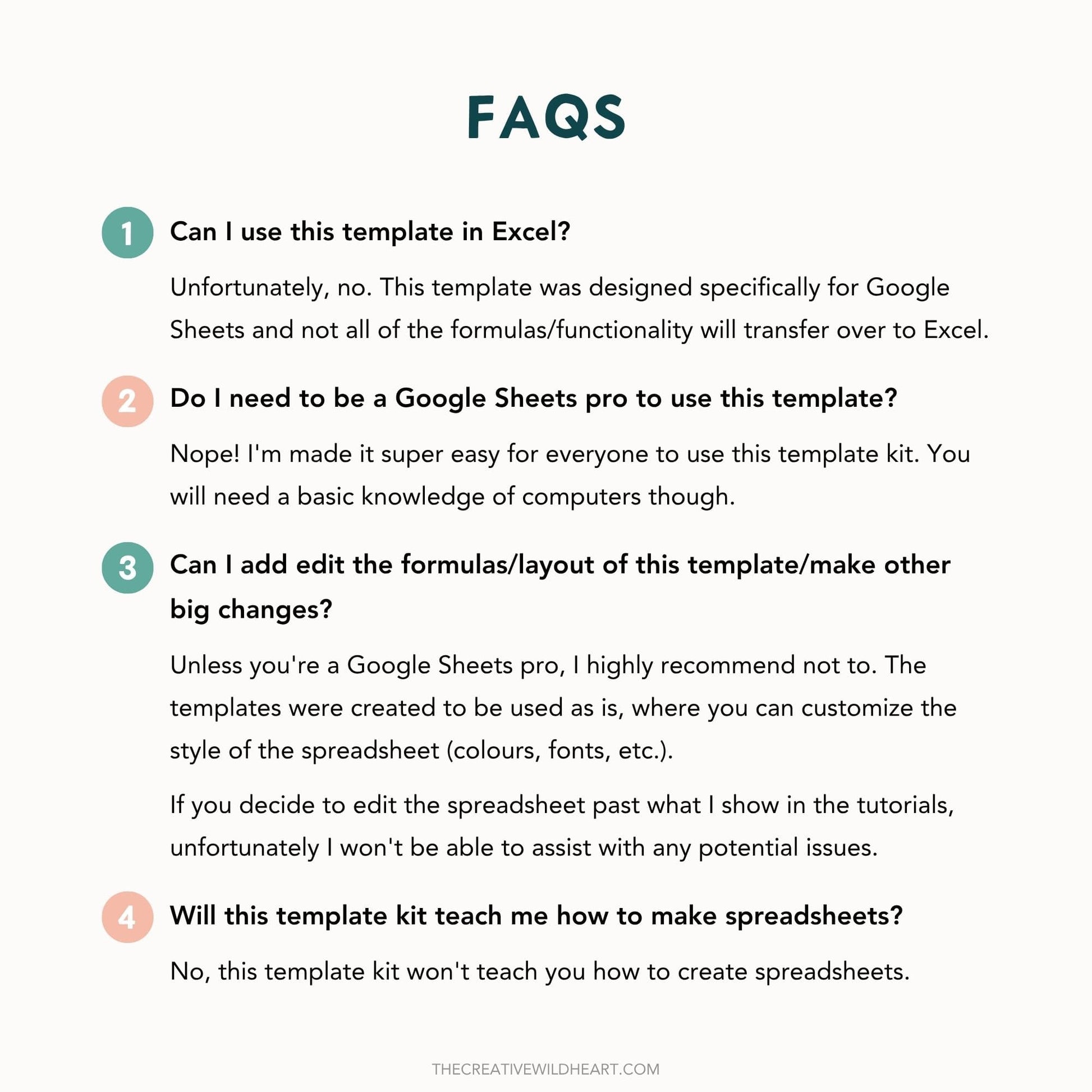 If you are a Google Sheets pro and decide to edit the formulas or layout, please note that I won't be able to help with any issues that may arise with changing the formulas or layout.