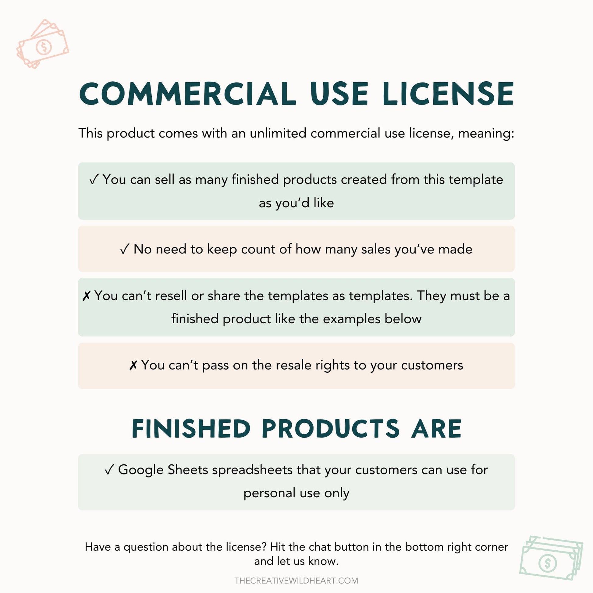 You can take the templates in this kit to create a finished product to sell in your own shop. Your customers can use the spreadsheets for personal use only.